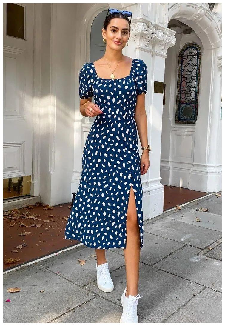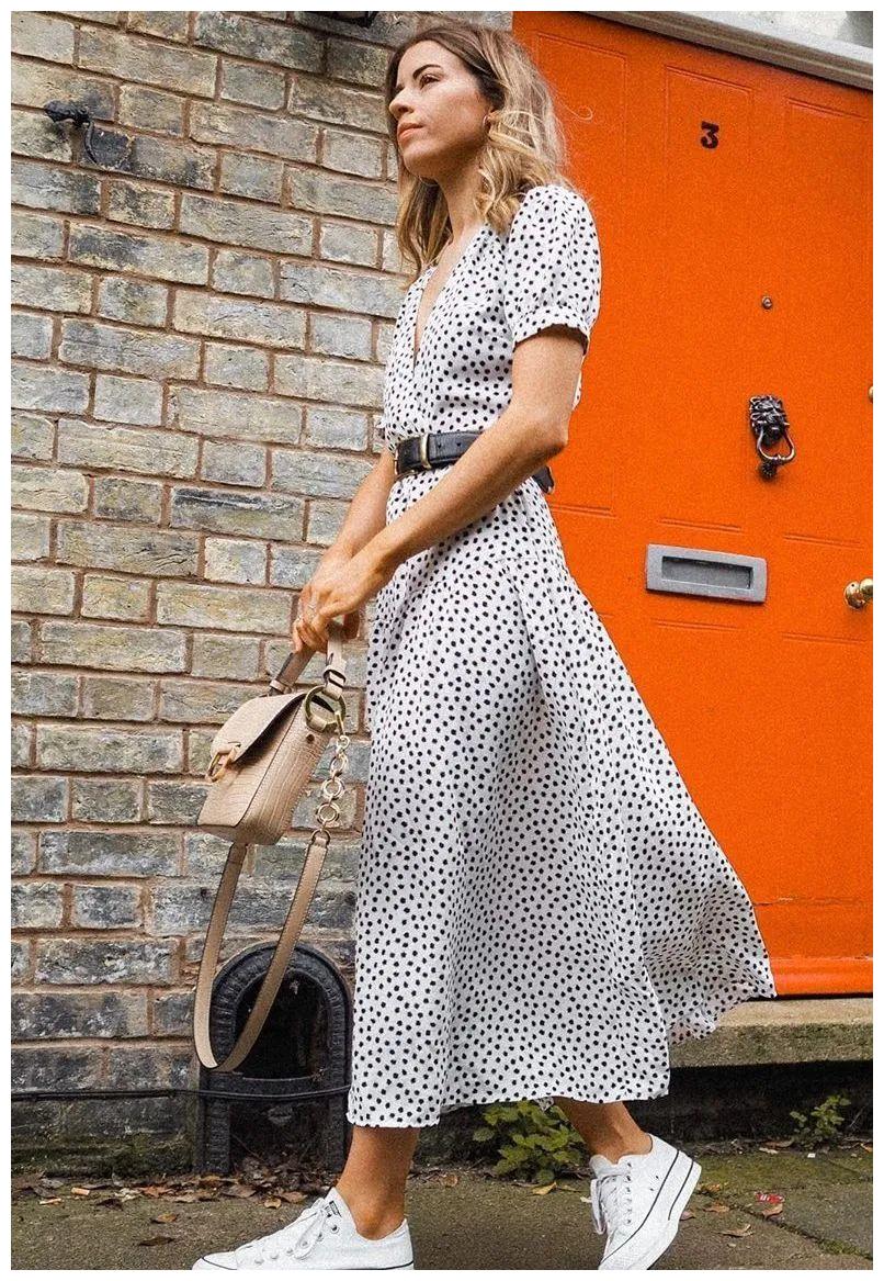 由于印花裙本身就是非常养眼吸睛的存在,所以我们日常其实搭配最简洁百搭的小白鞋效果会更加出彩。