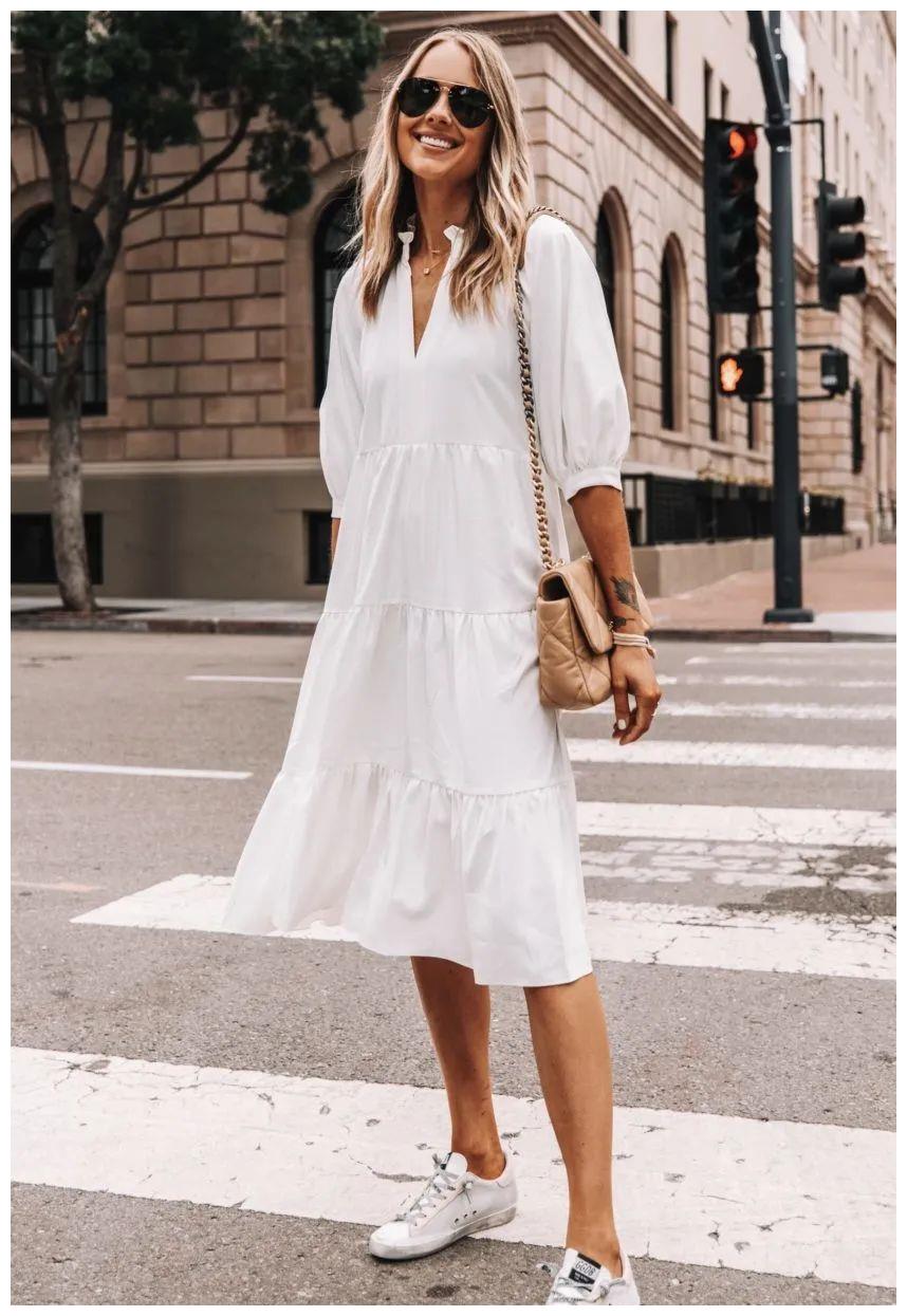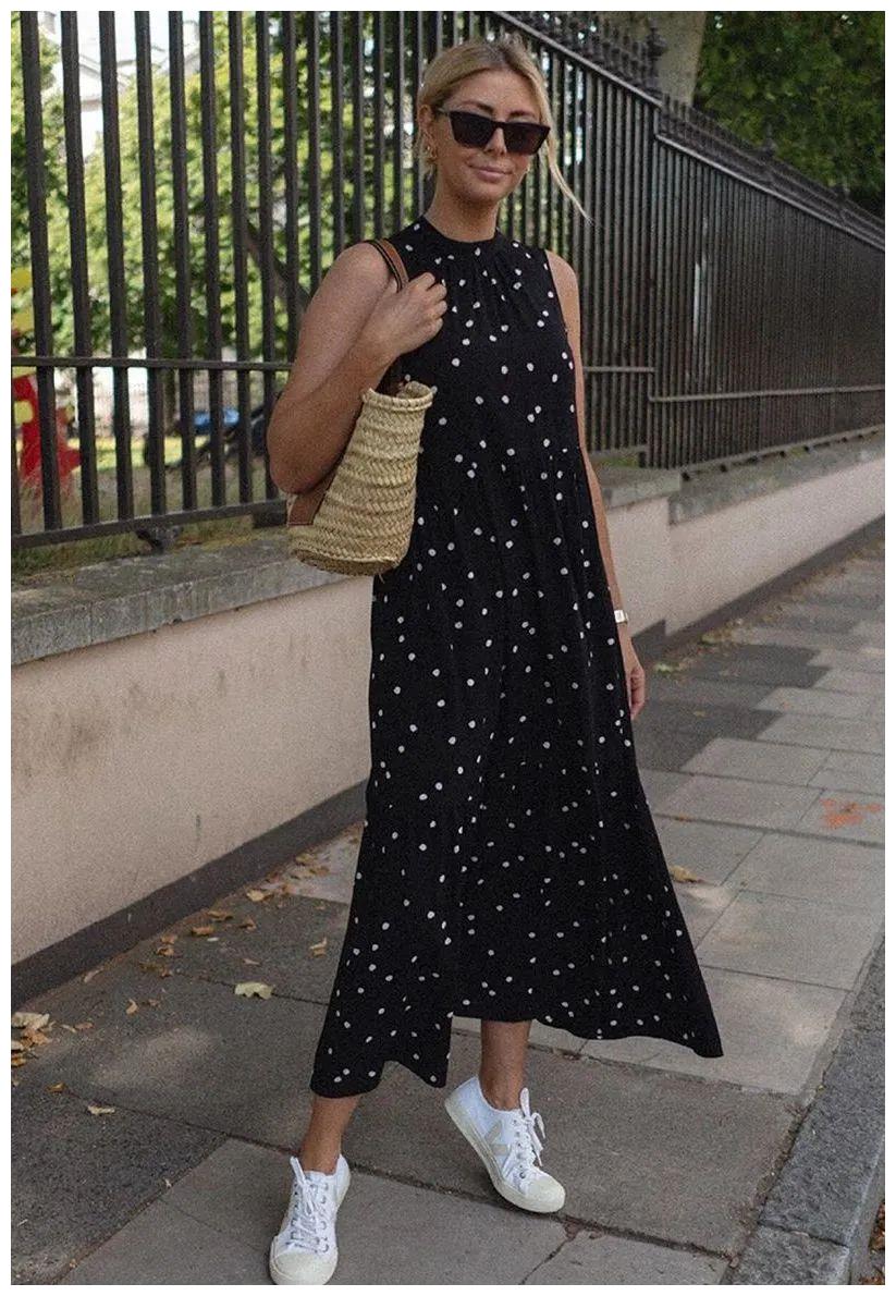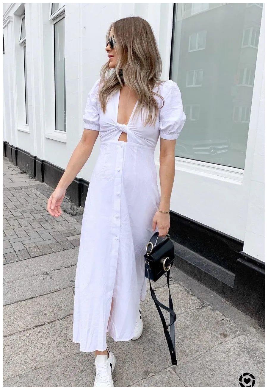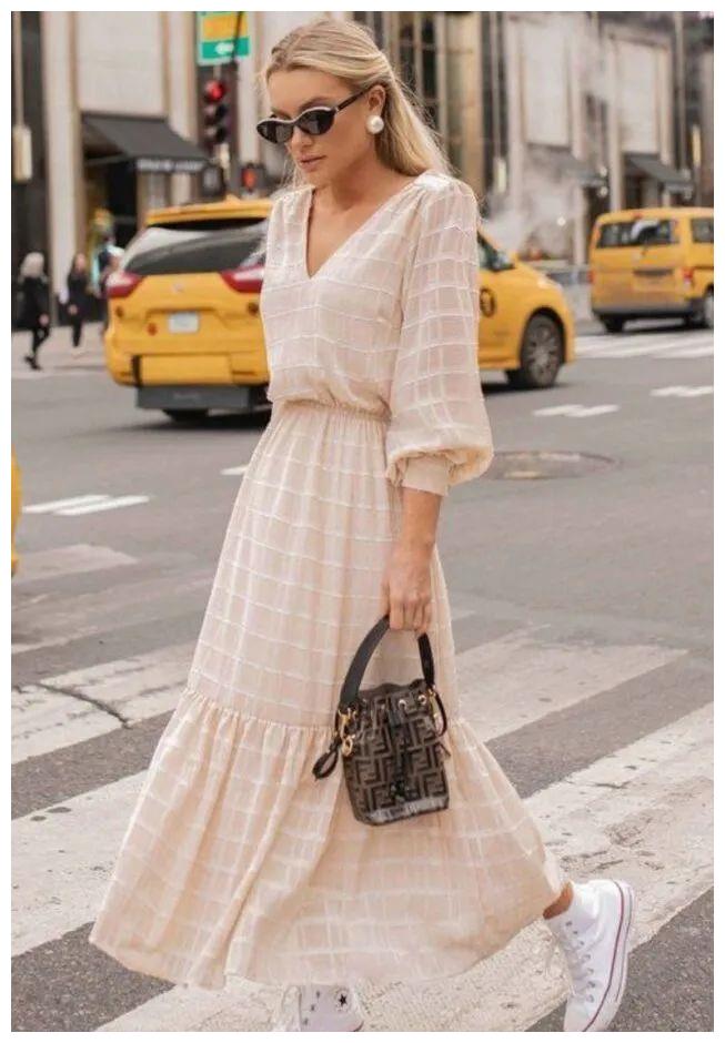 休闲挂的运动鞋可以中和掉泡泡袖连衣裙的正式感隆重感,让你的夏日穿搭更显亲和力。