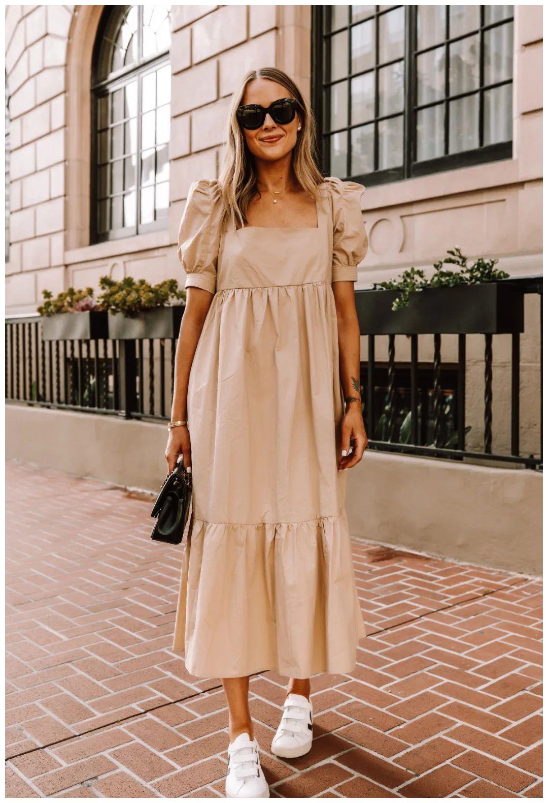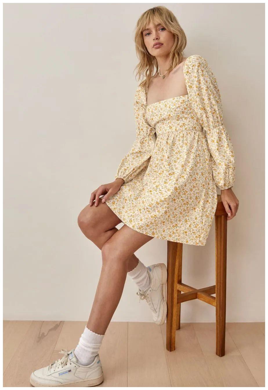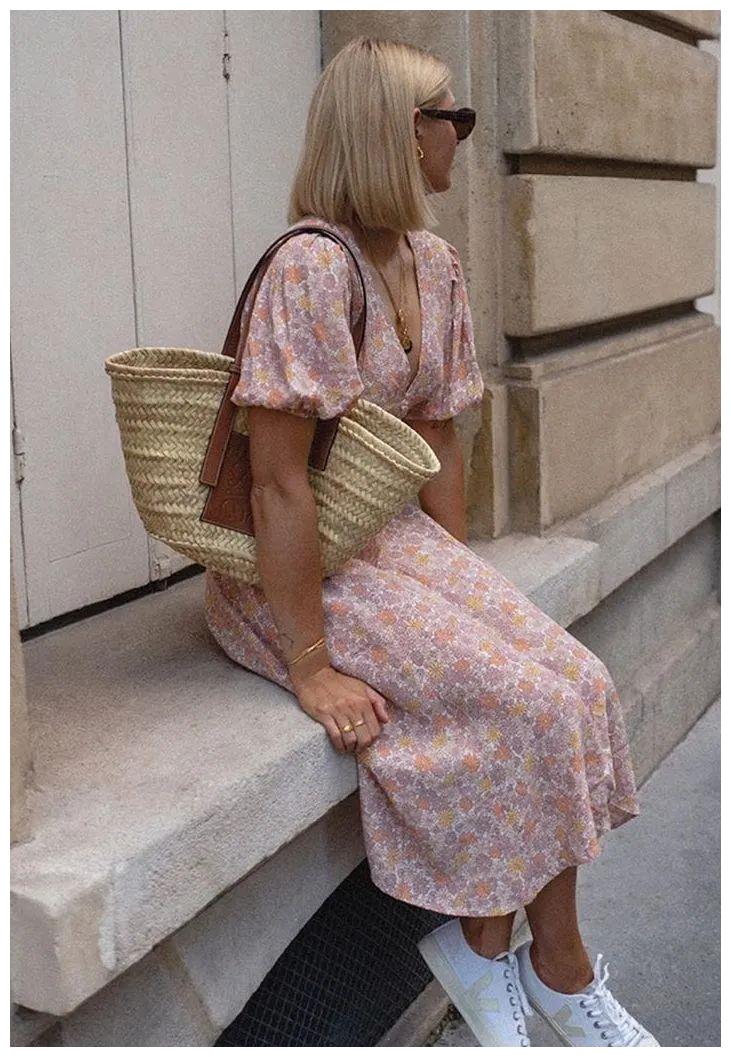休闲挂的运动鞋可以中和掉泡泡袖连衣裙的正式感隆重感,让你的夏日穿搭更显亲和力。