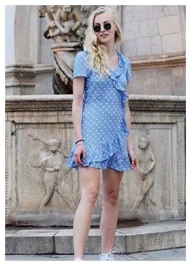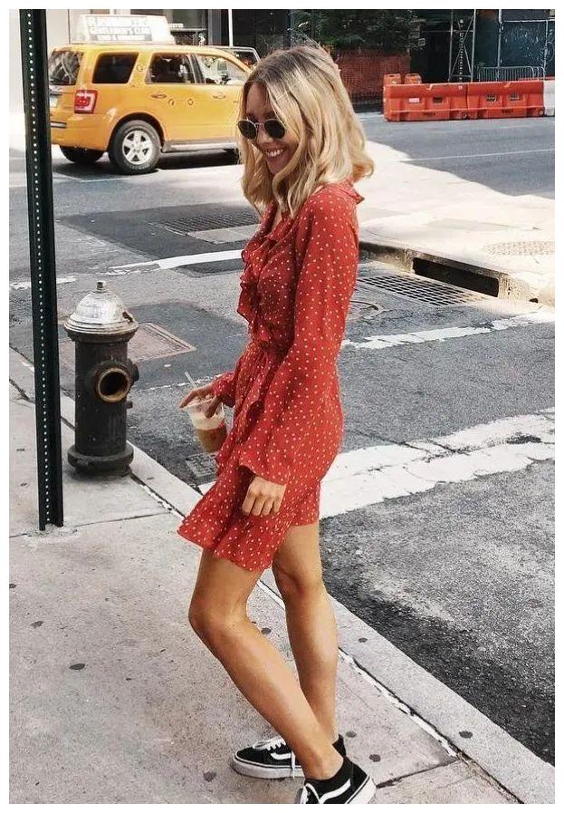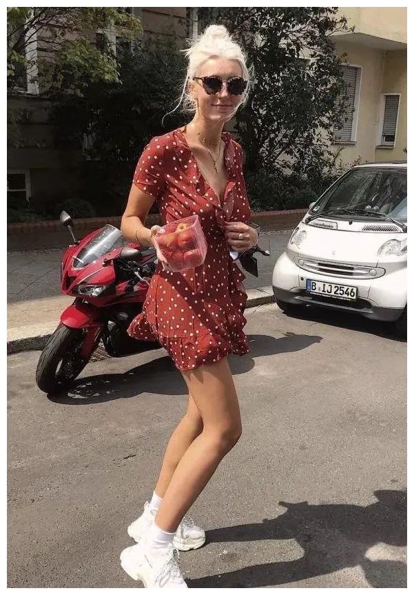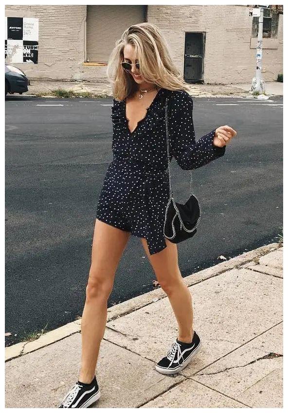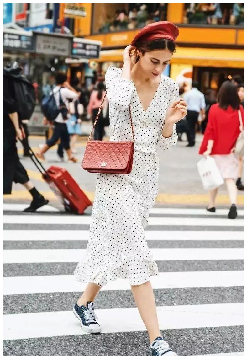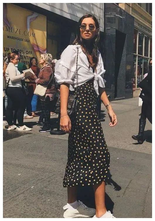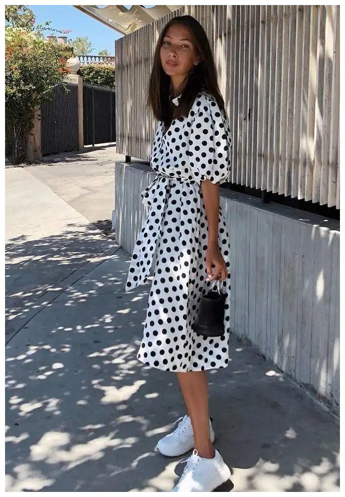 像波点裙+运动鞋的组合就是今夏的人气混搭套路之一,