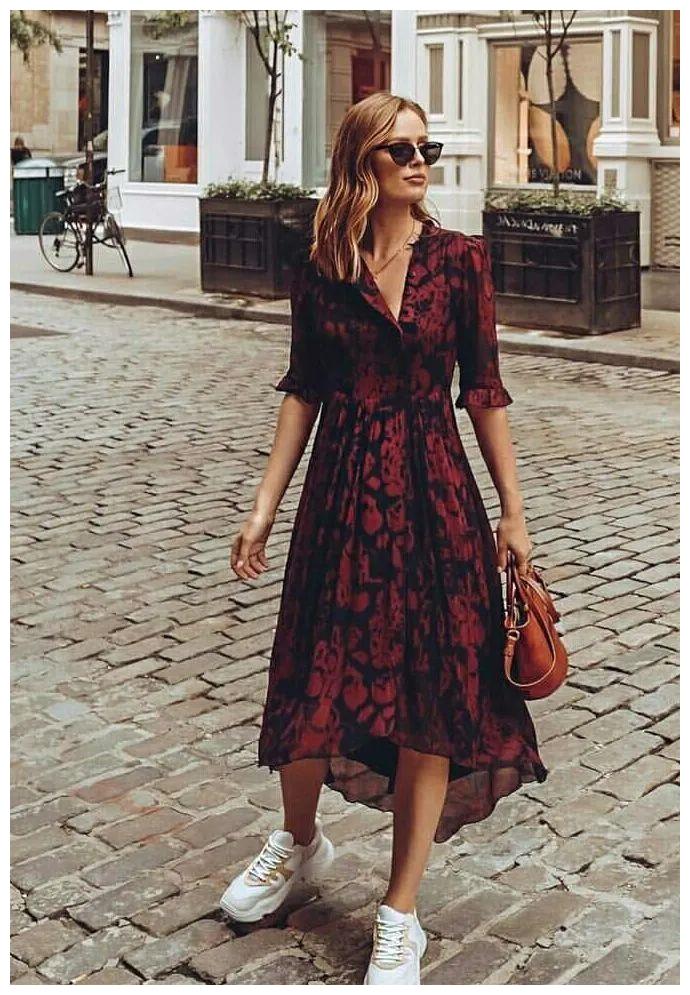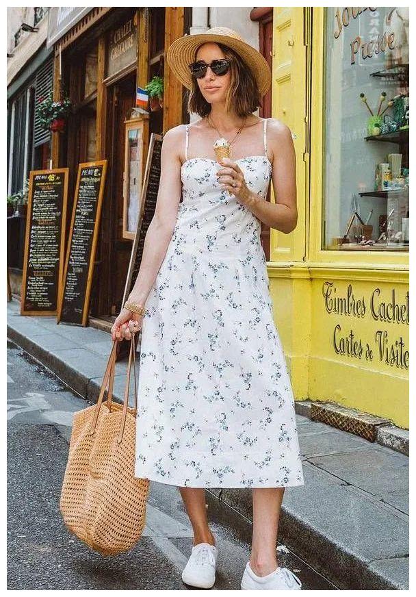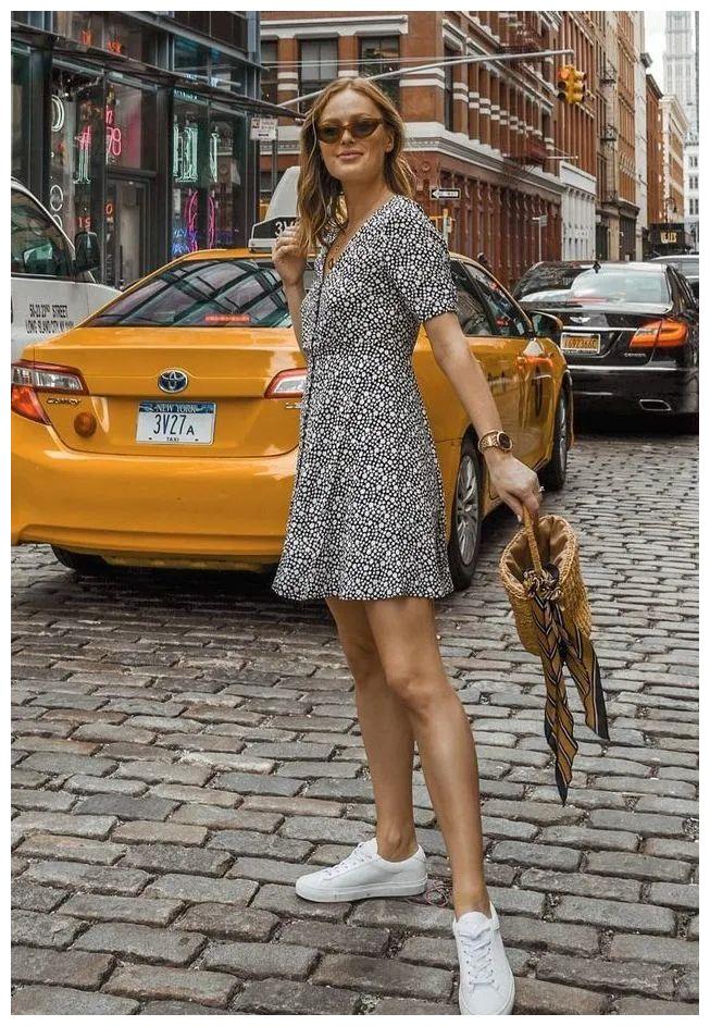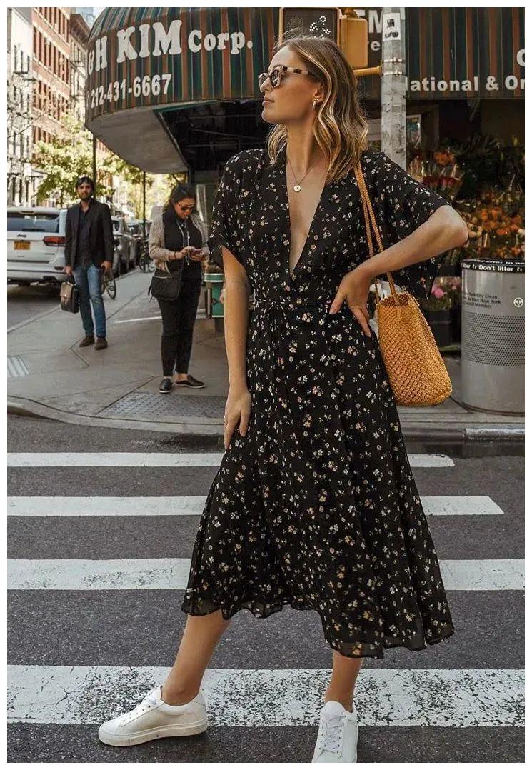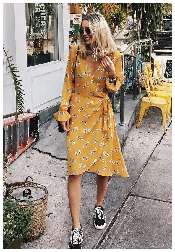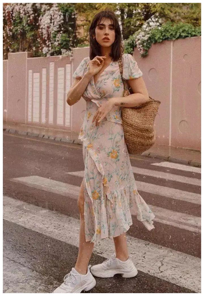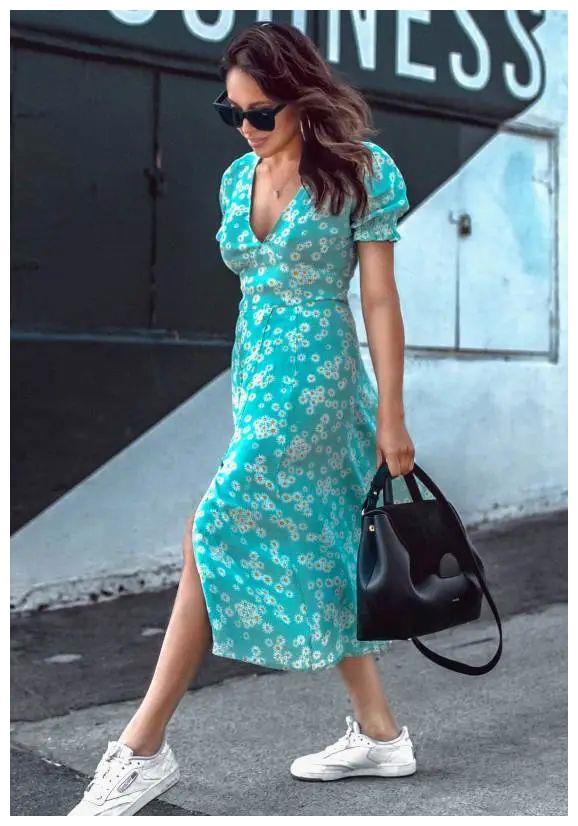 当然姐还是更建议各位选择花色本身就比较素雅的印花裙来和运动鞋搭配,