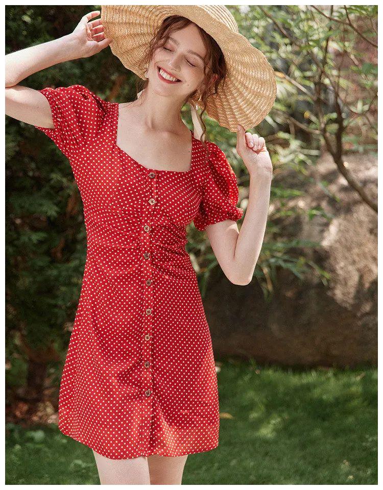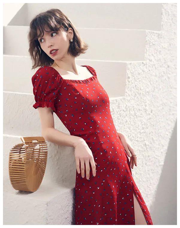红色印花方领开衩连衣裙荷叶边喇叭袖仙女必入碎花连衣裙