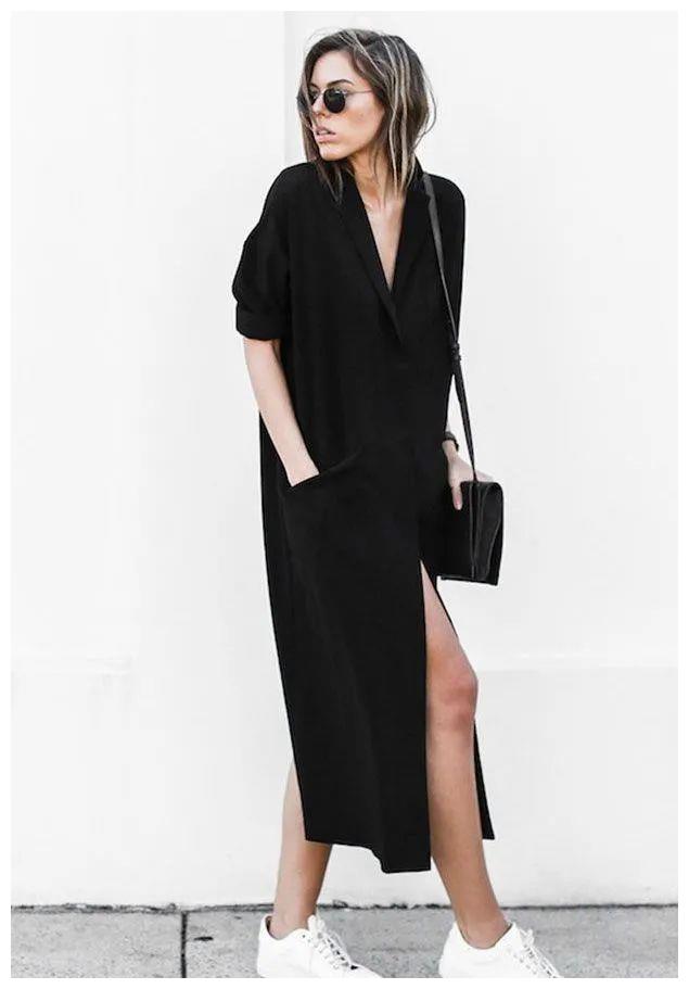黑色初恋衬衫裙在视觉上能够有更出色的显瘦效果,并且也更显干练优雅的魅力特质。混搭运动鞋,可飒可美别具一番韵味风情。