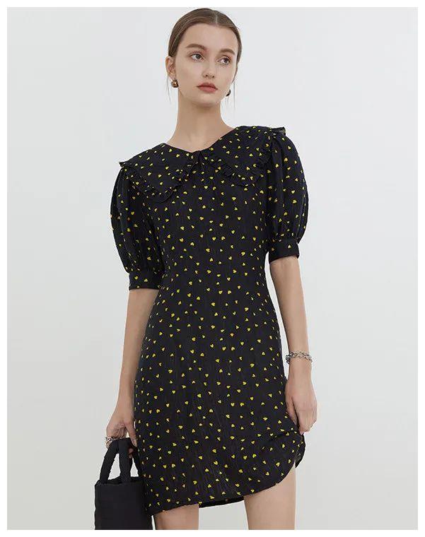 爱心印花娃娃领收腰泡泡袖连衣裙
