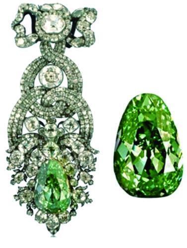 绿色代表生命、望与宁静。德累斯顿绿色钻石是一颗重41克拉的天然绿色钻石。据说这枚绿钻出产自世界著名的钻石产地之乡—印度戈尔康达。在自然界中,绿色钻石是非常稀有的,而且大多数的颜色都在很浅的表面,因此优质的绿色钻石十分稀少。“德累斯顿绿钻”具有通体均匀的天然绿色,介于祖母绿的鲜绿和绿玉髓的灰绿之间,因其极度稀有的绿色成为当今世界上无人能超越的最大的绿色钻石。