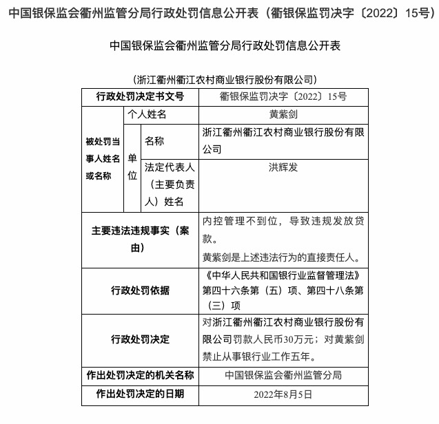 中华网财经8月11日讯,据银保监会消息,中国银保监会衢州监管分局公布的行政处罚信息公开表(衢银保监罚决字〔2022〕15号)显示,浙江衢州衢江农村商业银行股份有限公司因内控管理不到位,导致违规发放贷款。黄紫剑是上述违法行为的直接责任人,衢州监管分局依据《中华人民共和国银行业监督管理法》第四十六条第(五)项、第四十八条第(三)项,对浙江衢州衢江农村商业银行股份有限公司罚款人民币30万元;对黄紫剑禁止从事银行业工作五年。处罚日期2022年8月5日。